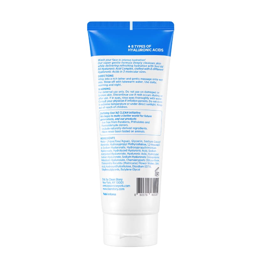 Wash your face in intense hydration! Our super gentle formula deeply cleanses skin while delivering refreshing hydration with Soo'AE 8X Hyaluronic Acid Complex, crafted with 8 different Hyaluronic Acids in 3 molecular sizes.